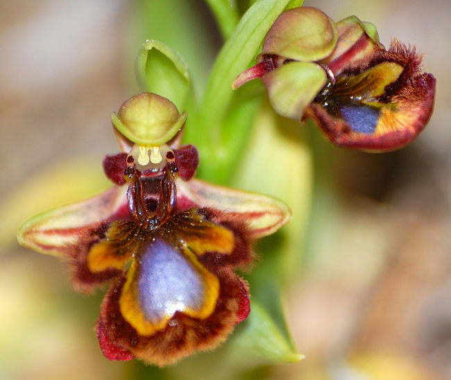 Mirror bee orchid. Each orchid has got its own insect that pollinates it and on which it is dependant. The yellow jacket is the insect of the mirror bee orchid. The flower resembles the female insect in such a way that the male insect prefers the flower to the real female.