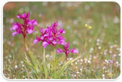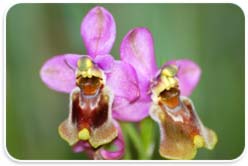 There are many opportunities to find orchids in many places. A few kinds of orchid are growing in the humid Dehesa, and therefore can be found all over the country. There are tongue serapias, anacamptis laxiflora as well as fragrant orchids among them. The summer lady´s tresses, the heart-shaped lip serapia and the snake tongue orchid are also growing near these types in a few places. When the pastures of the Dehesa look particularly rich and green, it is possible to find the relatively rare small-flowered tongue orchid. Many other kinds like the butterfly orchid, the milky orchid and sawfly ophrys flourish on less acidic ground. In the Guadiana valley there is a kind of orchid that grows only in that area and is therefore celebrated as a star of Extremadura’s flora. The green-flowered tongue orchid can best be distinguished from its related flowers due to its green colouration.