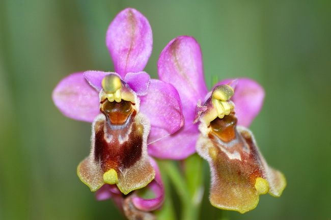 There are many opportunities to find orchids in many places. A few kinds of orchid are growing in the humid Dehesa, and therefore can be found all over the country. There are tongue serapias, anacamptis laxiflora as well as fragrant orchids among them. The summer lady´s tresses, the heart-shaped lip serapia and the snake tongue orchid are also growing near these types in a few places. When the pastures of the Dehesa look particularly rich and green, it is possible to find the relatively rare small-flowered tongue orchid. Many other kinds like the butterfly orchid, the milky orchid and sawfly ophrys flourish on less acidic ground. In the Guadiana valley there is a kind of orchid that grows only in that area and is therefore celebrated as a star of Extremadura’s flora. The green-flowered tongue orchid can best be distinguished from its related flowers due to its green colouration.