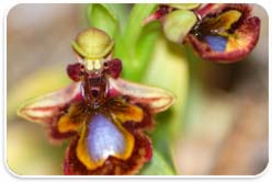 Mirror bee orchid. Each orchid has got its own insect that pollinates it and on which it is dependant. The yellow jacket is the insect of the mirror bee orchid. The flower resembles the female insect in such a way that the male insect prefers the flower to the real female.